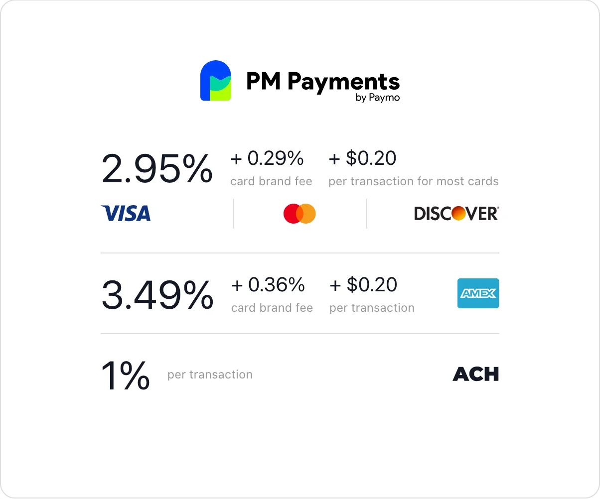 Whether your clients pay via Credit Cards or ACH, you always know exactly how much money you’re taking because of PM Payments’s straightforward pricing.